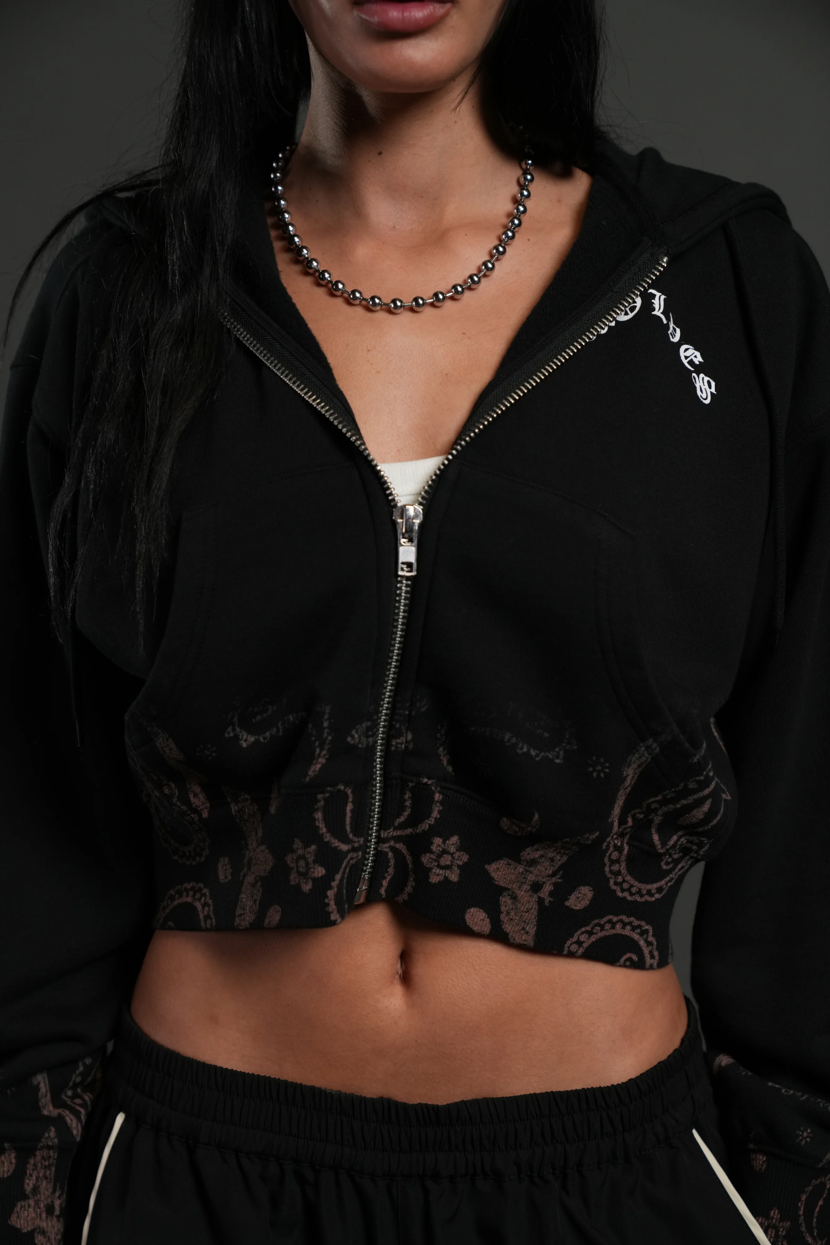 Faded Paisley "Sage" Cropped Zip Hoodie in Black