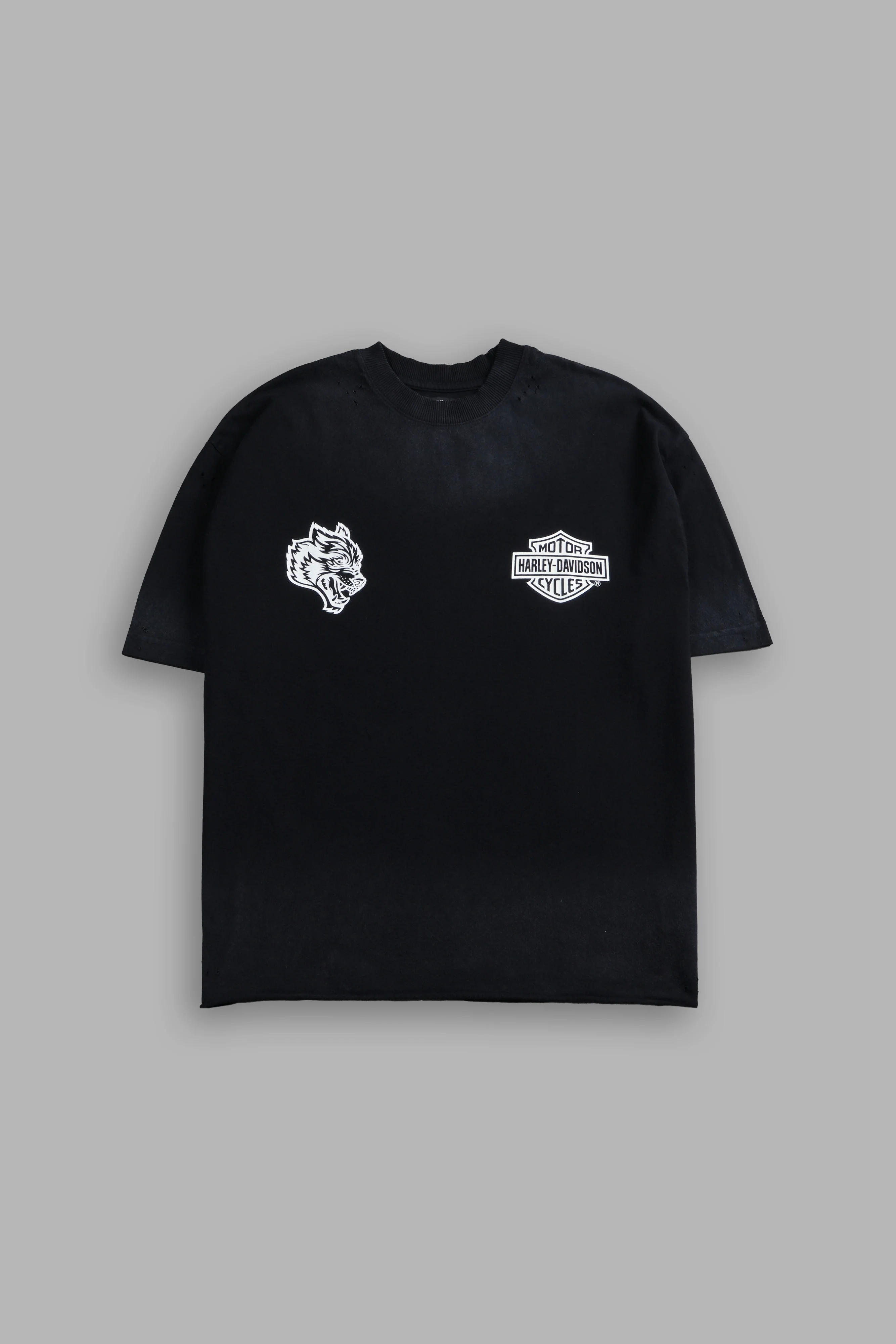 Harley-Davidson Wolves Distressed Grunge Mid-Length Raw Hem Tee in Black Drift Wash