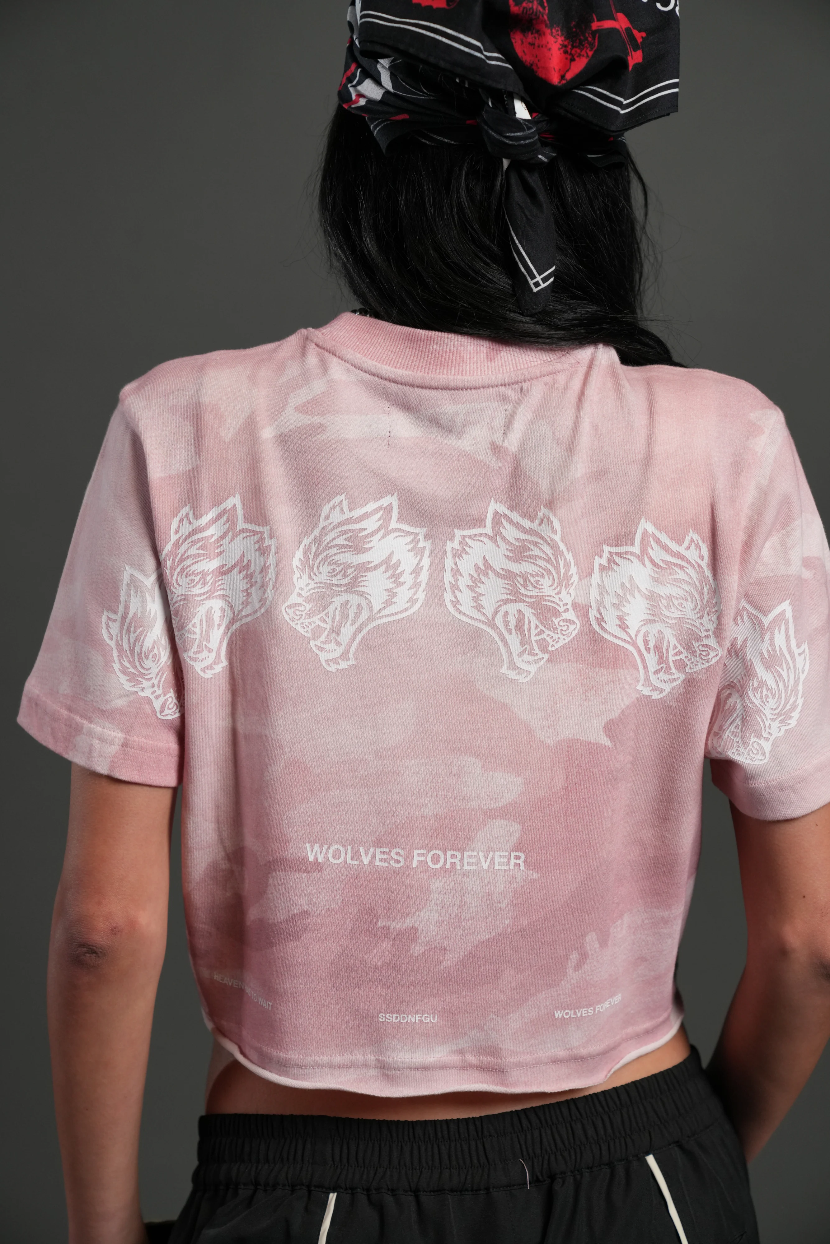 Wolves Have Your Back Premium Oversized Cropped Tee in Blush Vintage Woodland Camo—